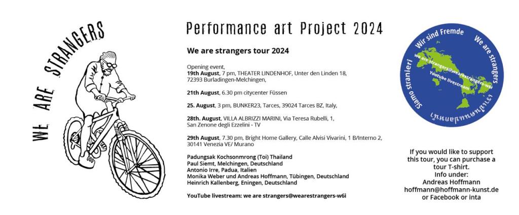 Each stop on the tour will leave its mark on the places and artists involved, creating artistic traces through organized and spontaneous performances. All the actions will be documented and broadcast live on YouTube (www.youtube.com/@wearestrangers-w6i) and on the Facebook page We Are Strangers.