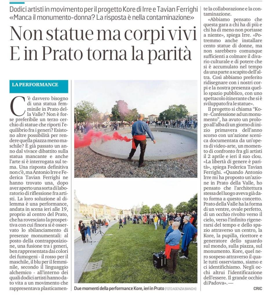 “La libertà di genere è parità – rilancia Federica Tavian Ferrighi – quando Antonio mi ha proposto un’azione in Prato della Valle, ho pensato che l’architettura stessa del luogo aveva già dato forma a questo concetto. Prato della Valle ha la forma di un ventre, ovale perfetto, di un occhio rivolto verso il cielo, verso l’infinito rigenerarsi del tempo e dello spazio attraverso un centro, la KORE, la pupilla, ricettore e generatore dello sguardo sul mondo, sulla piazza, sul monumento. KORE, quel nero sospeso attraverso il quale tutti osserviamo, siamo e ci identifichiamo. Negli occhi altrui l’identificazione dell’essere. Il grande occhio di Padova.”